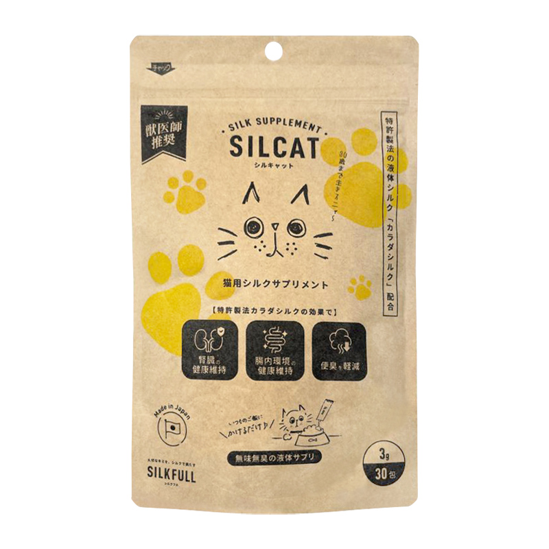 シルクは人工的には作ることが難しいナノレベルの繊細な多孔質構造(高分子シルクフィブロイン)で、目に見えない細い物質を吸着することが可能です。 カラダシルクは、この多孔質構造を維持したまま液化に成功しており、シルクのもつ機能を最大限に活用出来る特殊な技術です。 体内の老廃物を吸着・排出することで、腎臓ケア・腸内ケアへの配慮、胃腸の中にあるゴミ・アンモニアの除去による便・尿の臭いの軽減など、愛猫の健康はもちろん、飼い主さんにも嬉しい効果が期待できます。